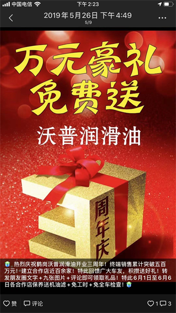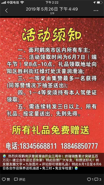 19年鹤岗区域代理商启动的部分活动和宣传类的信息,敢于将自己的网络及联系方式进行公开进一步证明了对于沃普品牌的信心,也迎合了沃普的产品理念:“不管是渠道经销店还是汽修厂还是最终端的使用客户,沃普产品可以做到一旦使用绝不拖离”只有具有超高性价比的产品稳定的产品线优良的企业服务理念才能做到这一点,以上活动全部由代理商自行投入进行也预示者其对厂家和产品的绝对信心。